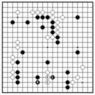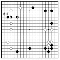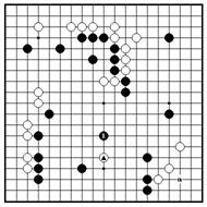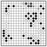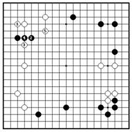 Белые, не зная как играть Белые камни наверху слева – маркированными камнями, решили плотные, но их влияние кажется, что прозондировать ходм 1. нейтрализовано двумя черными Как должны черные атаковать? камнями на левой стороне. Что должны делать белые? -112-