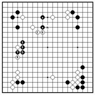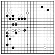 Проблема 91. Вариант Если белые блокируют с внутренней стороны на 2, черные будут ползти на 3. После 4 черные продолжают атаковать белые камни на 5, в тоже время строя себе территорию наверху слева, поэтому белые играют 6 для установки своих изолированных камней. Снова черные заканчивают в сентэ.