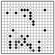 Проблема 92. Фальшивка Ч.1 сыгран в неправильном направлении. Белые получают больше территории в углу, чем они должны были получить, к тому же мое черных наверху сейчас не такое огромное, как раньше. Более того, маркированный камень стоит не на месте: он лучше смотрится в пункте “a”. Сейчас белые имеют хорошую есэ точку на “b”.