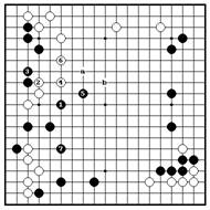Черные должны гнать белых наверх с Ч.1 не дает белым соединиться со помощью кейма 1. После обмена 2-3, своими камнями наверху, но белые прыгают на 4. Черные атакуют 5 белые легко убегают в центр и после б.6 прыгают на 7, создавая мое вариантом до 8. Перспективы внизу слева. Если б.”a”, черные будут черных на получение мое снизу прыгать на “b”. призрачные, т.к. черные должны защититься против б.”a”. Если ч.”b”, то б.”c” до сих пор содержит угрозу удара в “a”.