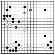 Проблема 100. Вариант 2 Так как белые слабы в центре, черные могут убежать 4 и 6, но черные камни наверху становятся уязвимыми после б.5. Далее –