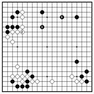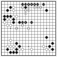 Черные должны атаковать черный камень наверху с помощью накрывания 1. Если черные ответят на 2, белые начнут штурм трех черных камней в центре ходами 3 и 5. Черные находятся в опасности.