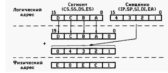 Пространство памяти емкостью 1 Мб представляется как набор сегментов, определяемых программным путем. Сегмент состоит из смежных ячеек памяти и является независимой и отдельно адресуемой областью памяти емкостью 64 Кб. Каждому сегменту программой назначается начальный (базовый) адрес, являющийся адресов первого байта сегмента в пространстве памяти. Начальные адреса важнейших 4-х сегментов, в данный момент времени выбранных в качестве текущих, записываются в сегментные регистры CS (кодовый), SS (стека), DS (данных), ES (дополнительный сегмент данных).