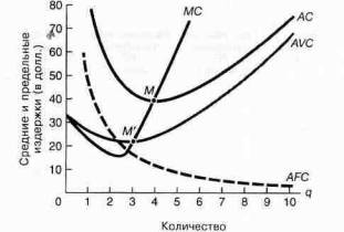Кривая средних издержек (ATC) имеет U-образную форму. Сначала средние издержки, т.к. большие постоянные издержки приходятся на незначительный объем производства. Затем по мере роста производства они падают до точки M. После достижения своего минимума, основное влияние на средние издержки начинают оказывать переменные издержки и кривая ATC идет вверх. Кривую ATC можно получить суммированием AVC и ATC: ATC=AFC+AVC.