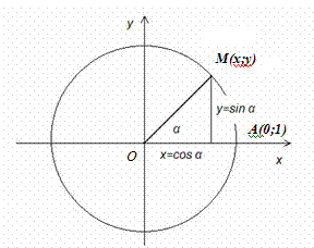 1º. На плоскости xOy рассмотрим окружность с центром в начале координат и радиусом, равным 1. На единичной окружности отметим точку A(1;0). Радиус OA называют начальным радиусом. При повороте начального радиуса на угол α около центра О точка А(1;0) перейдет в некоторую точку М(x;y). Заметим, что поворот можно осуществить по часовой стрелки (угол поворота положителен) или против часовой стрелки (угол поворота отрицателен).