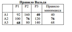 5.1.1. Правило Вальда ориентируется на ЛПР, настроенное пессимистично и стремящееся минимизировать потери. Оно признает только минимальную прибыль, но не убытки и выбирает опцию, которая максимизирует минимальную прибыль. Для каждой внешней ситуации фиксируется минимальное значение, а потом из этих худших значений выбирается максимальное (таблица 28). Таблица 28
