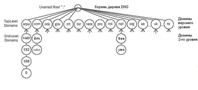 Пространство имен. Пространство имен DNS — иерархическая древовидная структура, начинающаяся с корня, не имеющего имени и обозначаемого точкой “.”. Схему построения пространства имен DNS лучше всего проиллюстрировать на примере сети Интернет (Рис. 3.8).