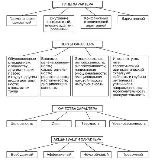 Рис. 95. Структура характера В отличие от психопатий акцентуации характера не вызывают общую социальную дезадаптацию личности. Интенсивно проявляясь в подростковом возрасте, акцентуации характера со временем могут компенсироваться, а при неблагоприятных условиях — развиться и преобразоваться в «краевые» психопатии.