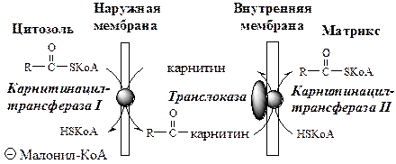 · В наружной мембране митохондрий фермент карнитинацилтрансфераза I (карнитин-пальмитоилтрансфераза I) катализирует перенос ацила с КоА на карнитин с образованием ацилкарнитина; · Ацилкарнитин проходит через межмембранное пространство к наружной стороне внутренней мембраны и транспортируется с помощью карнитинацилкарнитинтранслоказы на внутреннюю поверхность внутренней мембраны митохондрий; · Фермент карнитинацилтрансфераза II катализирует перенос ацила с карнитина на внутримитохондриальный HSКоА с образованием Ацил-КоА; · Свободный карнитин возвращается на цитозольную сторону внутренней мембраны митохондрий той же транслоказой.