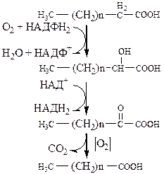 Фитановая кислота, ЖК с разветвлённой углеводородной цепью, образуется из фитола, который входит в состав хлорофилла. В этой кислоте у каждого третьего атома С находится метильная группа, что делает невозможным β-окисление данной кислоты. При α-окислении фитановой кислоты вначале удаляется метильная группа, а затем происходит цикл β-окисления. ω-Окисление ЖК ω-Окисление протекает в ЭПР, начинается с гидроксилирования ω-углеродного атома ЖК монооксигеназой (Р450) и в результате окисления приводит к образованию ЖК с двумя карбоксильными группами, которые разрушаются β-окислением с обеих сторон до дикарбоновых кислот: адипиновой (С6) и субериновой кислоты (С8), которые, выводятся с мочой.
