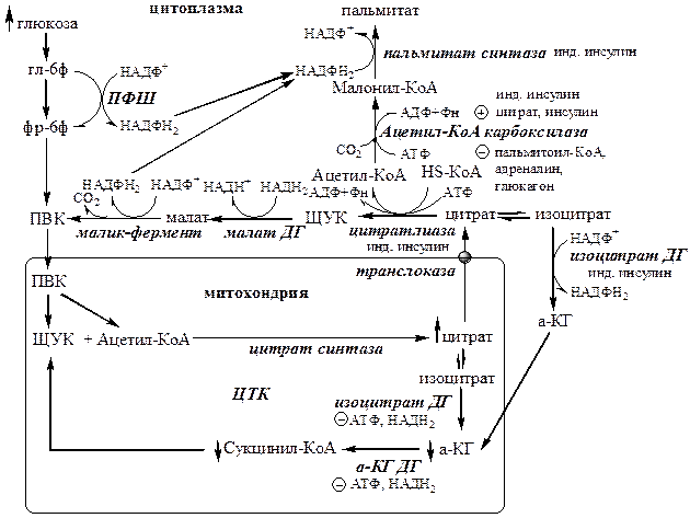 Образование субстратов, необходимых для синтеза ЖКОбразование и транспорт Ацетил-КоА. В реакциях гликолиза из глюкозы образуется ПВК, который поступает в матрикс митохондрий и превращается в Ацетил-КоА с участием ПВК ДГ. Так как внутренняя мембрана митохондрий непроницаема для Ацетил-КоА, поэтому он при участии цитратсинтазы конденсируется с ЩУК с образованием цитрата: Ацетил-КоА + Оксалоацетат → Цитрат + HS-КоА. Затем транслоказа переносит цитрат в цитоплазму. Перенос цитрата в цитоплазму происходит только при увеличении количества цитрата в митохондриях, когда изоцитратдегидрогеназа и α-кетоглутаратдегидрогеназа ингибированы высокими концентрациями НАДН2 и АТФ (при избытке углеводов и низком энергопотреблении). В цитоплазме цитрат расщепляется под действием фермента цитрат-лиазы: Цитрат + HSKoA + АТФ → Ацетил-КоА + АДФ+ Pн + ЩУК Образование НАДФН2. 1) ЩУК в цитоплазме превращается в малат под действием малат ДГ, малат под действием малик-фермента превращается в ПВК, при этом образуется НАДФН2. ПВК транспортируется обратно в матрикс митохондрий; 2) НАДФН2 образуется в цитоплазме из глюкозы в окислительных реакциях ПФШ; 3) Цитрат изомеризуется в изоцитрат, который дегидрируется цитозольной НАДФ-зависимой ДГ до α-КГ с образованием НАДФН2. α-КГ переноситься в матрикс митохондрий.