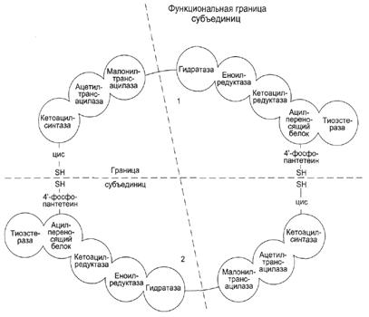 Образование пальмитиновой кислоты После образования малонил-КоА синтез пальмитиновой кислоты продолжается на мультиферментном комплексе — синтазе жирных кислот (пальмитоилсинтетазе). Пальмитоилсинтаза - это димер, состоящий из двух идентичных полипептидных цепей. Каждая цепь имеет 7 активных центров и ацилпереносящий белок (АПБ). В каждой цепи есть 2 SH-гpyппы: одна SH-гpyппa принадлежит цистеину, другая — остатку фосфопантетеиновой кислоты. SH-группа цистеина одного мономера расположена рядом с SH-группой 4-фосфопантетеината другого протомера. Таким образом, протомеры фермента расположены «голова к хвосту». Хотя каждый мономер содержит все каталитические центры, функционально активен комплекс из 2 протомеров. Поэтому реально синтезируются одновременно 2 ЖК.