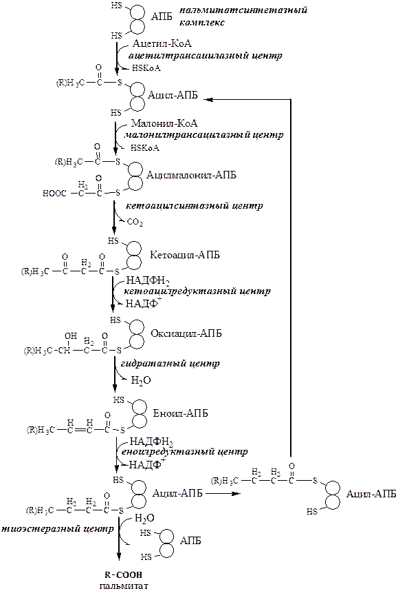 Этот комплекс последовательно удлиняет радикал ЖК на 2 атома С, донором которых служит малонил-КоА. Реакции синтеза пальмитиновой кислоты 1) Перенос ацетила с КоА на SH-группу цистеина ацетилтрансацилазным центром; 2) Перенос малонила с КоА на SH-группу АПБ малонилтрансацилазным центром; 3) Кетоацилсинтазным центром ацетильная группа конденсируется с малонильной с образованием кетоацила и выделением СО2. 4) Кетоацил восстанавливается кетоацил-редуктазой до оксиацила; 5) Оксиацил дегидратируется гидратазой в еноил; 6) Еноил восстанавливается еноилредуктазой до ацила. В результате первого цикла реакций образуется ацил с 4 атомами С (бутирил). Далее бутирил переносится из позиции 2 в позицию 1 (где находился ацетил в начале первого цикла реакций). Затем бутирил подвергается тем же превращениям и удлиняется на 2 атома С (от малонил-КоА). Аналогичные циклы реакций повторяются до тех пор, пока не образуется радикал пальмитиновой кислоты, который под действием тиоэстеразного центра гидролитически отделяется от ферментного комплекса, превращаясь в свободную пальмитиновую кислоту. Суммарное уравнение синтеза пальмитиновой кислоты из ацетил-КоА и малонил-КоА имеет следующий вид: CH3-CO-SKoA + 7 HOOC-CH2-CO-SKoA + 14 НАДФН2 → C15H31COOH + 7 СО2 + 6 Н2О + 8 HSKoA + 14 НАДФ+