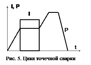 кристаллизация расплавленного металла точки проходила под давлением. Тем самым предотвращается образование усадочных дефектов - трещин, рыхлот и т.п. В некоторых случаях для улучшения структуры сварной точки усилие сжатия перед выключением тока увеличивается (проковка точки). Точечная сварка по количеству одновременно свариваемых точек может быть одно- , двух- и многоточечной. По способу подвода тока точечная сварка может быть двусторонней (рис.4а) и односторонней (рис.4б) При двусторонней сварке ток подводят к верхней и нижней заготовкам, при односторонней - к одной из них. Для повышения плотности тока в зоне соединения при одностороннем токоподводе заготовки располагают на токоподводящей медной подкладке. Одностороннюю сварку применяют при затрудненном доступе к одной из заготовок, а также при необходимости увеличения производительности процесса, так как в этом случае можно одновременно сваривать две точки. Один из циклов точечной сварки - цикл с проковкой представлен на рис 5.