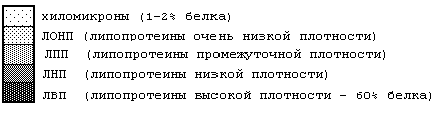 Рисунок 1 Все липопротеины имеют сходное строение: ядро состоит из гидрофобных молекул: ТАГ, эфиров холестерина, а на поверхности находится монослой фосфолипидов, полярные группы которых обращены к воде, а гидрофобные погружены гидрофобное ядро липопротеина. Кроме фосфолипидов, на поверхности находятся белки-апопротеины. Компоненты ядра связаны слабыми типами связей и находятся в состоянии постоянной диффузии – способны перемещаться друг относительно друга. Основная роль липопротеинов – транспорт липидов, поэтому обнаружить их можно в биологических жидкостях. При изучении липидов плазмы крови оказалось, что их можно разделить на группы, так как они отличаются друг от друга по соотношению компонентов. У разных липопротеинов наблюдается различное соотношение липидов и белка в составе частицы, поэтому различна и плотность. Липопротеины разделяют по плотности методом ультрацентрифугирования, при этом они не осаждаются, а всплывают (флотируют). Мерой всплывания является константа флотации, обозначаемая Sf (сведберг флотации). В соответствии с этим показателем различают следующие группы липопротеинов: