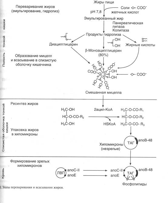 Рисунок 6 Реакции синтеза не зависят от того, каково происхождение веществ – участников реакций. Жиры, синтезированные в печени, упаковываются в ЛОНП (липопротеины очень низкой плотности) и секретируются в кровь. ЛОНП содержат апопротеины В-100, C-II, Е. Жиры, транспортируемые ЛОНП, подвергаются гидролизу под действием липопротеинлипазы в разных тканях, особенно активно в капиллярах крови жировой ткани. Жирные кислоты проходят в клетки и используются в разных тканях по-разному: в адипоцитах для синтеза жиров, в миокарде, скелетных мышцах окисляются, образуя АТР, необходимый для работы этих тканей. Активность липопротеинлипазы повышается в абсорбционный период под действием инсулина, когда в адипоцитах происходит синтез жиров, в котором используются как жирные кислоты, поступающие из крови, так и жирные кислоты, синтезированные непосредственно из продуктов распада глюкозы После еды при повышении концентрации глюкозы в крови увеличивается секреция инсулина. Инсулин активирует: 1)транспорт глюкозы внутрь адипоцитов (ГЛЮТ-4); 2) липопротеинлипазу, ее синтез в адипоцитах и экспонирование на поверхности стенки капилляра. Жирные кислоты проникают в адипоцит, а глицерин транспортируется в печень. Так как в адипоцитах нет фермента глицеролкиназы, то свободный глицерин не может использоваться для синтеза ТАГ в этой ткани. Активированные жирные кислоты взаимодействуют с глицерол-3-фосфатом, образующимся из диоксиацетонфосфата, и через фосфатидную кислоту превращаются в ТАГ, которые депонируются в адипоцитах (рис.7).