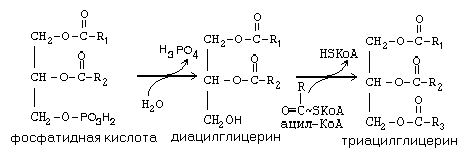 Здесь наблюдается глубокий распад АТФ до АМФ. АМФ не может вступить в окислительное фосфорилирование. Поэтому существует реакция: АТФ + АМФ Þ 2АДФ. Поэтому затраты на активацию молекулы жирной кислоты эквивалентны затрате двух АТФ. Следующим этапом на пути синтеза жира является реакция образования фосфатидной кислоты: