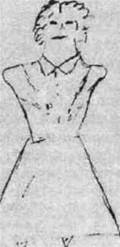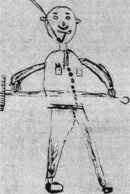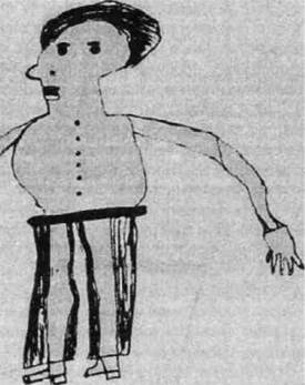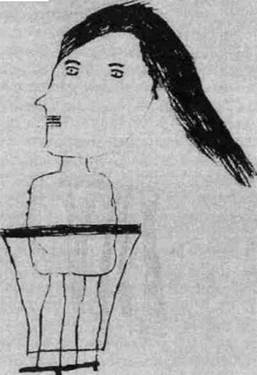 Рис. 5f ственным желанием было воссоединение с матерью, с которой он был разлучен восемь лет. Он заявляет, что это желание является мотивом его побегов. Домашняя обстановка пациента конфликтна. Это мешанина отчимов, мачех и воспитательниц; он не уверен в их преданности. Он также недоволен тем, что различные опекуны по-разному его называют. В настоящее время это беспокойный, сообразительный подросток, чье поведение сковано и обременено чувством вины. Имеет место робкая попытка идентификации с ушедшим отцом, которого он надеется заменить для своей матерн. Диагноз гласил: подростковый кризис у невротического мальчика с эмоциональной и психосексуальной незрелостью. Черты рисунка и интерпретация: рисунки были выполнены в молчании с предварительным выяснением - "все тело или только лицо?" Пациент сделал линейный рисунок сначала для мужчины, изобразив только ось тела и ноги (нежелание столкнуться с проблемами, которые встают перед ним). Затем были добавлены штаны, а телу была придана объемность. Потом робко последовали руки (контакт со средой), и в конце была нарисована голова (страх перед столкновением с межличностными проблемами). Женская фигура была также нарисована с необычной последовательностью (нарушенная логика), начиная с крошечных ступней и разрабатываемая робко и осторожно по направлению к голове (спорной точкой было будущее отношение пациента к его реальной матери). Тема рисунка - довольно драматическая проекция актуального поведения пациента. Мужская фигура описана пациентом как бегущая за автобусом, чтобы поехать на работу. (Пациент действительно чувствовал себя разрывающимся между конфликтующими привязанностями и проецированными потребностями и стремился избежать того и другого. На таблице V теста Роршаха он увидел "двух животных по сторонам, бросающихся на кролика, находящегося в середине". Он также высказал озабоченность успехами, на работе, необходимыми, чтобы поддерживать свою мать.) Мужская фигура была описана как симпатичная и хорошо одетая (надежда пациента), но не очень сильная (верно для пациента. Он тоненький и хрупкий). Он адвокат, двадцати девяти лет. неженатый (надежда заместить отца). Он удовлетворяет себя сексуально с помощью мастурбации (конфликт пациента. Обсуждая тему секса, он ссылался на таинственные взаимоотношения между двумя старыми девами, взявшими его на воспитание). Неуверенность, неадекватность и страх отражены в легкой, прерывистой и неравномерной линии. Эти характеристики также видны в смущенном выражении лица, в маленькой и тщедушной фигуре (как у самого пациента) и опасливом приближении к образу тела с вялыми ступнями у мужской фигуры и крошечными ступнями у женской фигуры. Выделение оси, отмеченное изначальной жирной линией, выполненной в качестве изображения тела, согласуется с телесной неполноценностью и озабоченностью собой, которые выявились клинически. Стремление добиться любви своей матери выражается в длинных, простертых руках, в то время как неуверенность в принятии ею видна в коротких руках женской фигуры. Отсутствие рук соотносится с чувством вины по поводу угонов машин, а также по поводу низких достижений (вина усугубляется требованиями его воспитателей). Он никогда не мог адекватно приспособиться к людям или вещам. Скромные достижения, беспокойство и бедность с