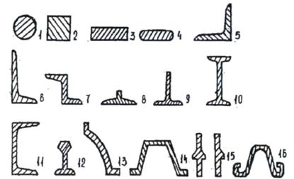 1 – сталь круглая; 2 – квадратная; 3 – полосовая; 4 – шинная; 5 – уголок равнобокий; 6 – уголок неравнобокий; 7 – зетовый профиль; 8, 9 – тавровый профиль; 10 – двутавровый профиль; 11 – швеллер; 12 – рельс; 13 – колонный профиль; 14 – корытный профиль; 15 – оконный профиль; 16 – шпунтовый профиль.