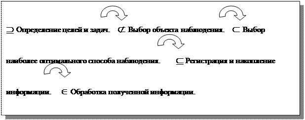 Научное наблюдение определяется как систематический, регулярный сбор информации об изучаемом объекте в соответствии с программой научного изучения проблемы. Таким объектом может быть криминологическая ситуация в определенном районе, микрорайоне, муниципальном образовании и т.д. С помощь такого метода изучается «живое» поведение лица или группы лиц в определенной среде, в коллективе, группе, семье. Процедура наблюдения обычно проходит через следующие стадии: