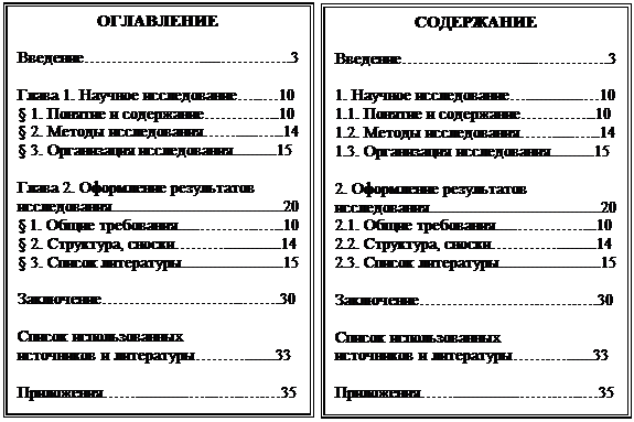 13. Если структурные части текста именуются главами и параграфами, то их перечень (в начале или конце рукописи) именуется «оглавлением». Если структурные части текста нумеруются (1; 1.1; 1.2 и т.п.), то их перечень именуется «содержанием». Например: