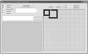 Поля слева управляют работой GP-алгоритма. Вот что они собой представляют. Generations. Алгоритм завершает работу после того, как сгенерировано указанное в этом поле число поколений. Однако, если удалось вывести идеального муравья (собирающего максимум пищи за минимум ходов), алгоритм немедленно прекращает работу. Population. Это число муравьев в каждом поколении. Популяция представляет собой смесь наиболее эффективных муравьев из предыдущего поколения и их потомства. Max Tree Depth. Сначала алгоритм генерирует муравьев случайным образом. Этот параметр задает, насколько глубокими могут быть начальные деревья выражений (expression trees) для муравьев. Food Goal и Step Goal. Хотелось бы вывести муравья, который соберет объем пищи, заданный в поле Food Goal, за число ходов, указанное в поле Step Goal. Однако при вычислении значения Step Goal не учитываются повороты, необходимые муравью, когда дорожка меняет направление. Чтобы посмотреть UI и приложение, выполним простой пример. Запустите приложение — его внешний вид показан на рис. 1. Ячейки с промежутками отделяют меньший квадрат с пищей в левом верхнем углу от более крупного квадрата, находящегося по соседству. Эти два квадрата содержат 33 ячейки с пищей и два промежутка. Следовательно, минимальное число ходов для сбора всей пищи равно 35. Не забывайте, что в этом минимальном числе не учтены повороты, необходимые, когда муравей находится в углу квадрата. Чтобы запустить процесс генетического программирования, оставьте в полях значения по умолчанию и щелкните кнопку Generate. Будет сгенерирована начальная популяция из 100 муравьев, каждый из которых следует случайной стратегии. Параметр Max Tree Depth равен 5, поэтому у муравьев начальной популяции дерево, содержащее операции выбора по условию, перехода и поворота, будет содержать максимум 5 уровней. В списке под кнопкой Generate показываются сводные данные по каждому поколению: средняя «приспособленность» («fitness») каждого поколения и приспособленность лучшего и худшего муравьев. О том, что такое приспособленность, я расскажу позже. А пока достаточно знать, что чем выше приспособленность, тем лучше. Когда будет сформировано десятое поколение, выберите сводные данные для Generation 1. В списке будут показаны все муравьи этого поколения. Каждый муравей представляется случайно сгенерированным классом. Для каждого муравья показываются имя, собранное количество пищи и число сделанных ими ходов. Имя класса муравья — GenX_AntY, где X — номер поколения, а Y — номер муравья в поколении. Лучший муравей поколения всегда показывается вверху списка. Выберите этого муравья в Generation 1. Когда вы выбираете муравья, сведения о нем выводятся в текстовом поле под списком. Показываются родители муравья, т. е. сообщаются имена классов, по которым он был сгенерирован. Под списком родителей показывается код, созданный для выбранного муравья. В дальнейшем я расскажу о коде подробнее.