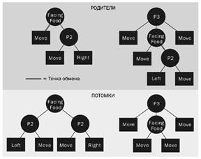 В своей книге Джон Коза привел многочисленные примеры проблем, которые можно решить с помощью генетического программирования. Он разработал систематический подход, при котором конкретным проблемам сопоставляется канонический набор архитектурных решений, используемый разработчиком для моделирования проблемы. В генетическом программировании используется набор объектов, которые Джон Коза назвал терминалами (terminals) и функциями. Муравьем управляют выражения поведения (behavior expressions) — древовидные структуры, состоящие из терминалов и функций. Терминалы — элементарные операции или литералы, которые нельзя разбить на подоперации. Функции — более высокоуровневые операции, использующие другие функции или терминалы. В нашем случае для искусственного муравья определены терминалы Left, Right и Move. Функцией в моем примере является логическая функция FacingFood, принимающая два аргумента терминала или функции. Выражение «if FacingFood, then Left, else Right» — пример выражения, содержащего функцию FacingFood и два потомка — терминалы Left и Right. Кроме того, я буду генерировать еще две функции. Первая, которую я назову P2, содержит две последовательные операции, которые также являются терминалами или функциями. Пример такой функции — выражение «Right;Move». Вторая функция, которую я добавлю, — функция P3. Она такая же, как P2, но содержит три подоперации. Пример P3 — выражение «Move; Right; if FacingFood then Right else Move». Сначала GP-алгоритм генерирует популяцию случайных выражений. Один из параметров алгоритма — размер популяции, который входит в число параметров, задаваемых пользователем в UI. Затем выражения выполняются и оцениваются в соответствии с критериями приспособленности. Разработка критерия приспособленности — еще одна составляющая канонического GP. Мне хотелось бы получить эффективных муравьев, которые собирают много пищи за небольшое число ходов. Поэтому в критерии приспособленности должны учитываться количество собранной пищи и число сделанных ходов. В своей реализации я вычитаю число ходов из количества собранной пищи и добавляю 1000, чтобы величина приспособленности всегда была положительной. У муравья с более высокой приспособленностью больше шансов на выживание, чем у муравья с более низкой приспособленностью. После начальной случайной генерации первого поколения начинается настоящая работа GP-алгоритма. Первый этап — селекция, при которой выбираются лучшие муравьи, копируемые в очередное поколение. Во многих реализациях GP используются сложные методики селекции, но в моей реализации ради простоты копируются 10% муравьев, лучших согласно нашему критерию приспособленности. Эти муравьи станут «родителями» муравьев следующего поколения. В следующее поколение в первую очередь включается пул родителей, который копируется из предыдущего поколения. Поскольку это лишь 10% популяции, мне нужно заполнить остальные «вакансии». Для этого я беру родителей и, чтобы создать очередное поколение, получаю от них потомство. Выбираются пары родителей, и каждая пара родителей приносит пару потомков, каждый из которых сочетает элементы родителей. Родители выбираются согласно их приспособленности. Вообще говоря, у более приспособленных родителей больше шансов принести потомство. Чтобы получить пару детей от пары родителей, применяется алгоритм «перекрестной передачи хромос