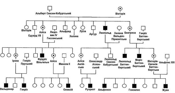 Мал. 34. Родовід з Х-зчепленою гемофілією А в царських сім'ях Європи