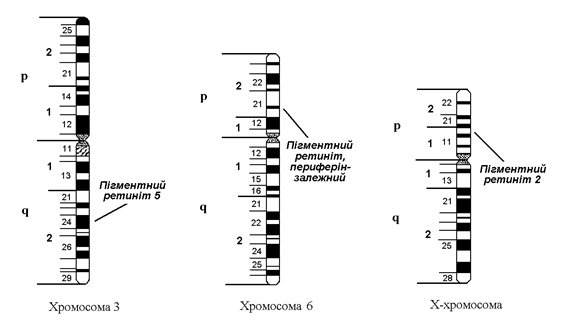 Мал. 37. Локалізація генів деяких форм пігментного ретиніту на хромосомах