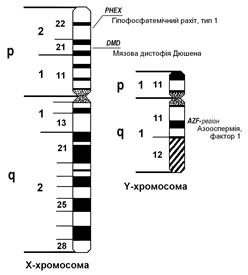 Психічно дитина розвивається нормально, але стає мовчазною, не спілкується з однолітками. У дівчаток хвороба проявляється у легкій формі – лише затримкою росту та гіпофосфатемією. Іноді захворювання у дитини проходить без лікування, але поновлюється в дорослому віці, наприклад у жінок під час вагітності та лактації. Лікування загальновизнаними дозами вітаміну D виявляється безуспішним. Проте хвороба відступає під дією великих доз активних метаболітів цього вітаміну. В лікувальний комплекс включають також препарати кальцію та фосфору. У випадку тяжких уражень скелета застосовують ортопедичні засоби, а якщо необхідно, то і хірургічне втручання. З метою запобігання деформації кісток немовляті не дають надто рано ставати на ноги та ходити. Х-зчеплені рецесивні захворювання. На ці хвороби нездужають переважно чоловіки. Тяжкість таких патологій варіює в широких межах, наприклад у чоловіків – від безпліддя за синдрому Леша – Найхана до порівняно легких порушень у вигляді деяких форм облисіння. До Х-зчеплених рецесивних захворювань відносяться міодистрофія Дюшена, гемофілія (див. розділи 3.3.3. та 4.3.2.), ангідротична ектодермальна дисплазія, вроджена гіпоплазія наднирникових залоз, адренолейкодистрофія, дальтонізм та інші. М'язова дистрофія Дюшена є досить розповсюдженою та тяжкою нервово-м'язовою хворобою. Частота її складає 1:3000-5000 новонароджених хлопчиків. Захворювання обумовлене порушенням синтезу білка дистрофіну, ген якого (DMD) локалізований в короткому плечі Х-хромосоми (Xp21.2) (мал. 43). Перші ознаки хвороби, у вигляді утруднень при вставанні з підлоги чи після присідання, з'являються у 3-5 років. Хворі діти не вміють бігати та скакати. Захворювання полягає у прогресуючій дистрофії м'язів з поступовим до 14-15 років знерухомленням дитини. М'язова тканина заміняється жировою та сполучною, починаючи з м'язів ніг. Ознаки хвороби розповсюджуються поступово угору по тілу. При цьому порушується моторика шлунково-кишкового тракту. На завершальній стадії хвороби атрофія захоплює м'язи обличчя, глотки та дихальні м'язи, порушуються функції серця. Хворі гинуть протягом 2-3-го десятиліття життя. У половини хворих можливе зниження інтелекту аж до дебільності. Лікування, спрямоване на підтримання фізичної активності (спеціальна лікувальна гімнастика) пацієнта, та покращення умов життя виявляються малоефективними. Використовують протези, які дозволяють хворим рухатися та уповільнюють формування сколіозу. При появі обмеження рухливості суглобів показане хірургічне втручання. Для уповільнення розвитку хвороби призначають медикаментозне лікування. Y-зчеплені хвороби. Цих патологій відомо всього кілька, оскільки чоловіча статева хромосома має незначну кількість генів (близько 100), із яких ідентифіковано близько 20. Гени, які визначають такі патології, не мають аналогів у Х-хромосомі. Таким чином, Y-зчеплені хвороби визначаються лише одним алелем, виявляються тільки у чоловіків і передаються від батька усім синами. Серед цих захворювань – азооспермія, гіпертрихоз (волосатість країв ушних раковин), перетинки між пальцями ніг та іхтіоз (лускоподібна шкіра). Азооспермія. На Y хромосомі людини розташовано кілька десятків генів, контролюючих формування статевих ознак, у тому числі розвиток яєчок та процес сперматогенезу. Різні мутації в ст