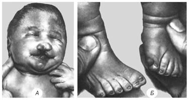 Мал. 49. Аномалії обличчя (А) та стопи (Б) за синдрому Патау: