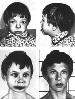 Розумова відсталість, викликана хромосомними абераціямиDate: 2015-10-07; view: 451. Спадкові хвороби, спричинені порушеннями будови хромосом, теж характеризуються вадами розумового розвитку. Серед них найвідомішими є синдром Вільямса – Бейрена, синдром Лежена, синдром Вольфа – Хіршхорна та інші. Найхарактернішими ознаками синдрому Вільямса – Бейрена (синдром «обличчя ельфа») є незвичайне обличчя, звуження надклапанної частини аорти або легеневої артерії, підвищений вміст кальцію в плазмі крові. Популяційна частота захворювання варіює в межах 1:10000-25000 новонароджених незалежно від статі. Патологія спричинена делецією в довгому плечі 7-ої хромосоми (7q11.23), яка обіймає близько 15 генів. Основними клінічними ознаками синдрому Вільямса – Бейрена є короткий ніс з відкритими вперед ніздрями, широка верхня і вузька нижня щелепа, надто широкий рот, повні щоки, відкопилені вуха, епікант, малий зріст. (Мал. 64).