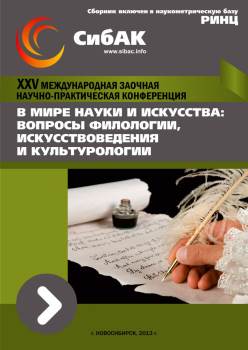 «В мире науки и искусства: вопросы филологии, искусствоведении и культурологии» (Россия, г. Новосибирск, 8 июля 2013 г.) Уважаемые коллеги! Мы рады приветствовать всех авторов публикаций, проявивших интерес к рассматриваемым вопросам: научных работников и преподавателей вузов, специалистов в области филологии, искусствоведения и культурологии, аспирантов и соискателей. Цель Конференции – публикация результатов научных исследований ученых, аспирантов, докторантов и практикующих специалистов по актуальным проблемам современной филологии, искусствоведения и культурологи, обмен научными результатами и исследовательским опытом.
