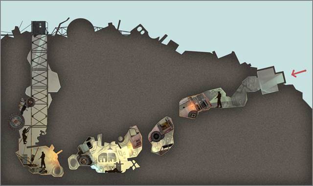 Тайник располагается в пустотах под холмом со свалкой техники. Вход представляет собой контейнер с люком, запирающимся снаружи. Когда игрок спускается в тайник, Клык, тайно проследивший за ним от лагеря, запирает люк. Наемник оказывается в начале лаза, уходящим вглубь под холм. Лаз то сужается, то становится шире, петляет. После пары поворотов Игрок натыкаемся на старый автобус, вросший в спрессованный мусор, и составляющий единое целое с горой. Фары тускло освещают лаз, мигает оранжевая габаритная лампочка. Наемник продолжает спуск внутри салона автобуса и обнаруживает, что его задняя дверь заперта. Возвращается к водительскому креслу, открывает дверь, идёт дальше. Ещё пару поворотов внутри лаза — и он оказывается в тайнике Копателя. Схема тайника Черного Копателя Это небольшое уютное помещение, где можно стоять в полный рост. Из стен торчат остовы автомобильной техники. У самого сохранившегося грузовика заведён двигатель, который и питает электричеством все лампочки в тайнике. Наемник видит матрац, стол (жестяной лист на бочке) и раскладную табуретку; это уютное место — ведь здесь Копатель не только хранил артефакты, но и жил временами, укрываясь от бурь или выбросов. На полу труп, подплывший кровью, вокруг следы погрома. В руке у трупа порванная фотография, и когда Наемник берет ее, то видит двух человек: того самого раненого сталкера из лагеря, который отправил игрока в тайник и еще одного мужчины, на фоне ЧАЭС! На обратной стороне записка от Стрелка к Клыку и Призраку со списком деталей, которые нужно собрать для дешифратора. В тексте указано место встречи – тайник группы. Увидев Клыка на фотографии, игрок понимает, что его обманули, этот мертвец в тайнике и есть Черный Копатель, а в лагере он на самом деле разговаривал с Клыком. Но тогда почему был так сильно изранен Клык, а Копальщик мертв? В этот момент из темного угла под заведённым «ЗИЛом» слышится рычание. Игрок не видит кровососа, так как это место заслонено щитом (старым агитационным плакатом с изображением счастливой работницы и какой-нибудь дурацкой призывной надписью о мужестве). Кровосос бьет в щит, пытаясь прорваться к игроку. Как на зло начинает мигать освещение в бункере. За щитом находится труба – это единственный выход из тайника. Подойдя ближе к щиту или выпустив в него очередь, игрок активирует сцену с кровососом. (Помещение должно быть достаточно просторным, чтобы кровосос мог передвигаться). Убив кровососа, перед игроком открывается труба – лаз, который идет к выходу. Теперь игроку все ясно. Клык убил Копальщика, забрал детали из тайника, но потом на него напал кровосос. Клык едва унес ноги от кровсоса, и, увидев, что игрок ищет именно его, будучи сильно израненным, просто отправил его в ловушку.