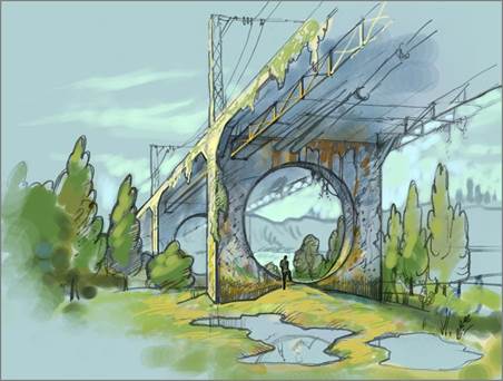 Наемник спускается под мост, к опорам. Они представляют собой монументальные бетонные плиты с выразительными круглыми проёмами посередине. Ритм этих проёмов-колец, уходящих к дальнему берегу и вода между ними – главная визуальная «изюминка» данной локации. (См. рисунок). Пробираясь от одной опоры к другой, Игрок решает различные аркадные мини-задачки: проходит по деревянным помостам, сооруженным бандитами, прыгаем по руинам моста, частично выглядывающим из-под воды. Наконец, добирается до нескольких грузовых барж, на которых бандиты поставили временный лагерь. Баржи уставлены контейнерами, ящиками и бочками – здесь начинается стелсовый геймплей. Последнее отверстие в опоре моста ведёт внутрь холма, под землю. Так Наемник попадает к подземельям Агропрома.