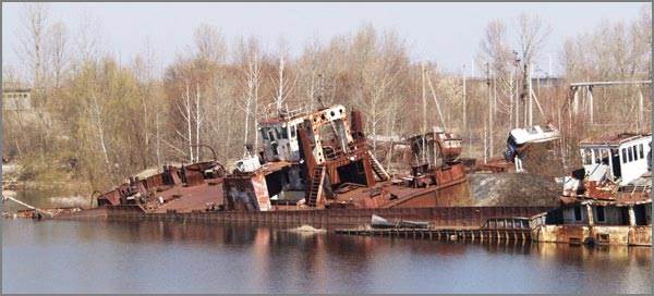 - Река Припять. Аутдорная сцена с видом на реку. Две-три ржавые баржи, песчаные обрывы. Вода реки стекает в специальный колодец, который не даёт уровню подняться выше. По мокрым скобам мы спускаемся в этот колодец. Заходим в коллектор.