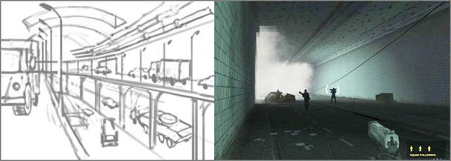 Прохождение уровня «Технокапище» будет максимально линейным (по подобию Half-Life 2). События и сцены предстанут перед игроком в нужной для нас последовательности – сцены с узкими, душными коридорами будут сменяться просторными помещениями или даже аутдорными пространствами с открытым небом, но огороженными таким образом, чтобы сохранялась линейность. Это позволит нам сконцентрироваться на детализации и отшлифовке.