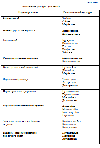 Виходячи з аналізу суспільних відносин можна виокремити такі види політичної культури.Date: 2015-10-07; view: 402. Типологія і функції політичної культури