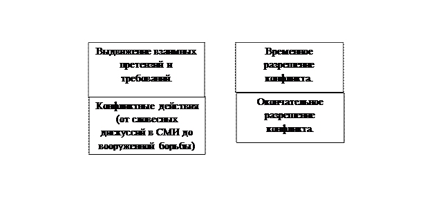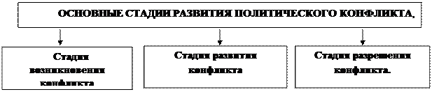 Политический кризис: типы и виды.Date: 2015-10-07; view: 452. Типология политического конфликта. Конфликт как социальное явление. Сущность политического конфликта. В политической науке конфликт рассматривается как социальное явление, под которым понимается столкновение (противоборство) общественных сил, отдельных групп или лиц, происходящее в ходе разрешения осознанного ими противоречия, возникшего из взаимоисключающихся интересов или способов их достижения. Современные представления о политическом конфликте – результат длительной эволюции идей о конфликтах в сферах общественной жизнедеятельности. Теории конфликтов в основном сложились в XIX-XX вв. Существует три основных подхода к пониманию роли конфликтов в обществе: 1) Признание ведущей роли конфликтов в общественном развитии, принципиальной неизбежности и неустранимости их из жизни, (это направление представляют Г. Спенсер, Л. Гумплович, К. Маркс, Г. Моска, Л. Козер, Дарендорф, К. Боулдинг, М.А. Бакунин, П.Л. Лавров, В.И. Ленин и др.); 2) Отрицательное отношение к конфликтам, так как они проявляются в войнах, революциях, классовой борьбе, социальных экспериментах, признание их аномалиями общественного развития, вызывающими нестабильность, нарушение равновесия в социально-экономической и политической системах (сторонниками данного направления являются Э. Дюркгейм, Т. Парсонс, В.С. Соловьев, М.М. Ковалевский, Н.А. Бердяев, П.А. Сорокин, И.А. Ильин); 2) Рассмотрение конфликта в качестве одного из многих видов социального взаимодействия и социальных контактов наряду с конкуренцией, солидарностью, кооперацией, партнерством (выразители этого направления Г. Зиммель, М. Вебер, Р. Парк, Ч. Миллс, Б.Н. Чичерин и др.). Субъектами политического конфликта могут быть субъекты любых политических отношений: отдельные личности, активно участвующие в политической жизни и непосредственно влияющие на её функционирование и развитие; малые и большие группы (социальные группы, слои; классы; нации; государства и их коалиции, партии и т.д.; неформальные объединения в виде политизированных социальных движений, экономических и политических групп давления и т.д.). В политической науке существуют разные теоретические подходы, объясняющие причины возникновения политических конфликтов. Основными являются следующие: · Сточки зрения марксистского подхода причина политического конфликта это экономические противоречия. · С позиции ресурсного подхода источник конфликтов кроется в неравном распределении средств жизнедеятельности: территории, сырьевых и энергетических ресурсов, материальных и духовных благ, ресурсов власти, привилегий. · Сторонники ценностного подхода природу конфликта ищут во взаимоисключающих системах верований, убеждений, культурных стереотипах и несовпадениях представлений о справедливости, присущих разным социальным группам. · Приверженцы биологического подхода видят в конфликтах проявление присущего человеку инстинкта агрессивности, аналогичного инстинкту животных. Политический конфликт представляет собой определенный, имеющий начало и завершение процесс. Выделяют следующие стадии политического конфликта.