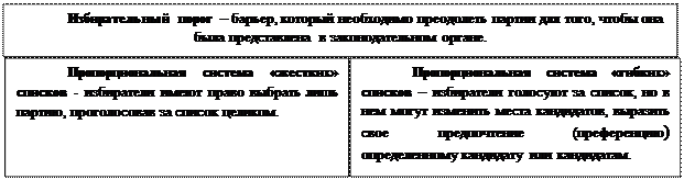 Избирательные системы.Date: 2015-10-07; view: 414. Избирательный процесс, его компоненты. Референдум. Избирательное право, его основные принципы. Выборы как институт непосредственной демократии. Основные функции выборов. Тема 16. Избирательный процесс. Понятие выборов, их основные функции. В современном цивилизованном обществе выборы являются процедурой, с помощью которой обеспечивается участие граждан в формировании представительных, законодательных, судебных и исполнительных органов государства. С выборами связана реализация политических прав граждан. Выборы - это способ существования демократии, способ смены правящих элит, передача власти от одних людей к другим мирным путем, через волеизъявление народа. Функции выборов: 1. Обеспечение участия граждан в формировании системы органов государственной власти и управления. В этом заключается главная функция выборов. 2. Функция легитимации власти и политического режима выражается в том, что через процедуру выборов народ определяет своих представителей в органах власти и наделяет их правом принимать соответствующие политические решения. Право должностного лица или представительного органа властвовать, если они избраны в результате голосования, под сомнение гражданами практически не ставится, наоборот - они считают своей естественной обязанностью подчиняться решениям избранных ими органов и лиц. Голосование означает придание режиму легитимности, согласие граждан с данной политической системой. 3. Функция определения содержания политики или выбора политического курса находит свое отражение в том, что граждане, высказывая свою поддержку тому или иному кандидату или определенной партии, тем самым делают свой выбор среди предлагаемых им политических программ. 4. Функция контроля состоит в том, что во время выборов граждане дают оценку результатам деятельности должностного лица, своего депутата или представительного органа власти, которые получили от них свой мандат на предыдущих выборах. Если эта оценка положительная, то избиратели подтверждают этот мандат, в противном же случае они отдают свои голоса за другого претендента. 5. Функция отбора и формирования политических лидеров и элит. 6. Функция показателя состояния политической жизни в стране: дают наглядную картину расстановки политических сил. В ходе подготовки к выборам политические партии и общественные объединения излагают перед избирателями свои идейные платформы и предлагают свои рецепты решения существующих социально-экономических и политических проблем. Избирательное право, его основные принципы. Выборы осуществляются посредством наличия института избирательного права Избирательное право - это совокупность юридических норм, регламентирующих участие граждан в выборах представительных органов власти и должностных лиц государства, подготовку и проведение выборов, взаимоотношения между избирателями и выборными органами или должностными лицами государства. Избирательное право в более узком, смысле – это гарантированная государством возможность гражданина участвовать в выборах либо в качестве избирающего, либо в качестве избираемого. Различают активное и пассивное избирательное право. Активное избирательное право - это право гражданина лично участвовать в выборах (избирать) членов представительны