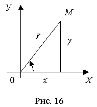 Из рис. 16 видно, что если полюс полярной системы совпадает с началом прямоугольной системы координат, а полярная ось - с осью абсцисс, то прямоугольные координаты точки М выражаются через ее полярные координаты следующим образом:
