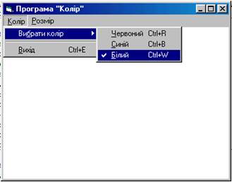 Створення менюDate: 2015-10-07; view: 347. Створимо додаток, вікно якого містить рядок меню з пунктами Колір і Розмір. Пункт меню Колір містить команду Вибір кольору (що викликає каскадне меню з командами: Червоний, Синій, Білий) і команду Вихід. Пункт меню Розмір містить команди Нормальний, Максимальний. Кожна команда повинна мати “гарячі клавіші” для виклику її за допомогою клавіатури. При виборі певного кольору необхідно щоб відбувалася зміна кольору робочої області вікна програми, а при виборі розміру вікно набувало або максимального розміру, або нормального. В результаті потрібно отримати програму, вікно якої зображено на рис. 9.