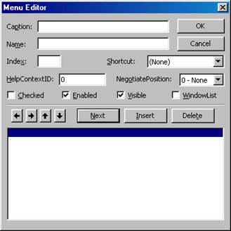 2. Для створення команд меню необхідно завантажити редактор меню Menu Editor (Tools\Menu Editor, або комбінація клавіш Ctrl+E). На екрані з'явиться діалогове вікно Menu Editor (рис. 10).