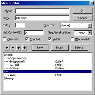 У властивість Caption введено символ & для того, щоб в меню підкреслювалась літера, за допомогою якої можна швидко виконати пункт меню. Натисніть на кнопку Ok в цьому вікні, а потім подивіться що з'явилося на формі. 3. Знову активізуйте редактор меню, і введіть назви команд меню Колір за допомогою кнопки Insert, і комбінацію гарячих клавіш (список Shortcut):