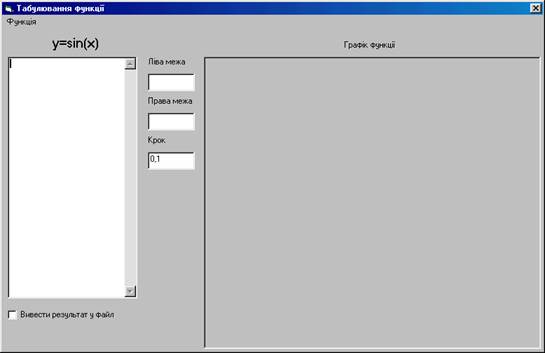 Рис. 15 Створення програми табулювання і побудови графіку функції y=sin(x) Створимо програму “Табулювання функції”. В ній початкове значення аргументу x буде вводитися в текстове поле “Ліва межа”, кінцеве значення в текстове поле “Права межа”. Крок в текстове поле “Крок”. Результат табулювання функції буде виводитись в багаторядкове текстове поле. Побудова графіку функції буде відбуватися в графічному полі. Вікно проекту повинно мати рядок меню з пунктом Функція, який містить в собі команди: Протабулювати, Побудувати графік, Очистити, Вихід. Також, у вікні програми необхідно щоб знаходився прапорець, який передбачає збереження результатів у файл при виході з програми.