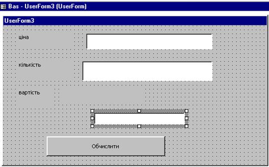 Приклади створення форми у системі Visual BasicDate: 2015-10-07; view: 428. Лекція№10 Приклад 1. Скласти форму, в якій буде відбуватися підрахунок вартості проданого товару. Private Sub CommandButton1_Click() Dim ціна As Single Dim кількість As Integer Dim р As Single ціна = Val(TextBox1) кількість = Val(TextBox2) р = ціна * кількість TextBox3 = ціна * кількість рез = Str(р)