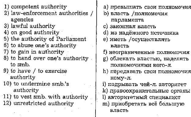 TASK 13. Study and rememberthe following meanings of the word “AUTHORITY”. Use them to make the sentences of your own in Russian and then render your sentences into English: · Власть; · Полномочие, право, права, компетенция; · Pl. Власти, начальство, администрация; · Авторитет, вес, влияние; · Крупный специалист; · Авторитетный источник. TASK 14. Study and remember the following expressions. Use them to make the sentences of your own: · Supreme authority – верховная власть · To act on smb's authority – действовать на основании полученных полномочий · Local authorities – местные органы власти, органы местного самоуправления · To have authority with smb – пользоваться авторитетом у кого-либо · He is an authority on law – он является авторитетом в области права · To quote one's authorities – ссылаться на авторитетные источники TASK 15. Read and translate the text “The Bill of Rights” and write down Russian equivalents for the words and expressions in bold type.