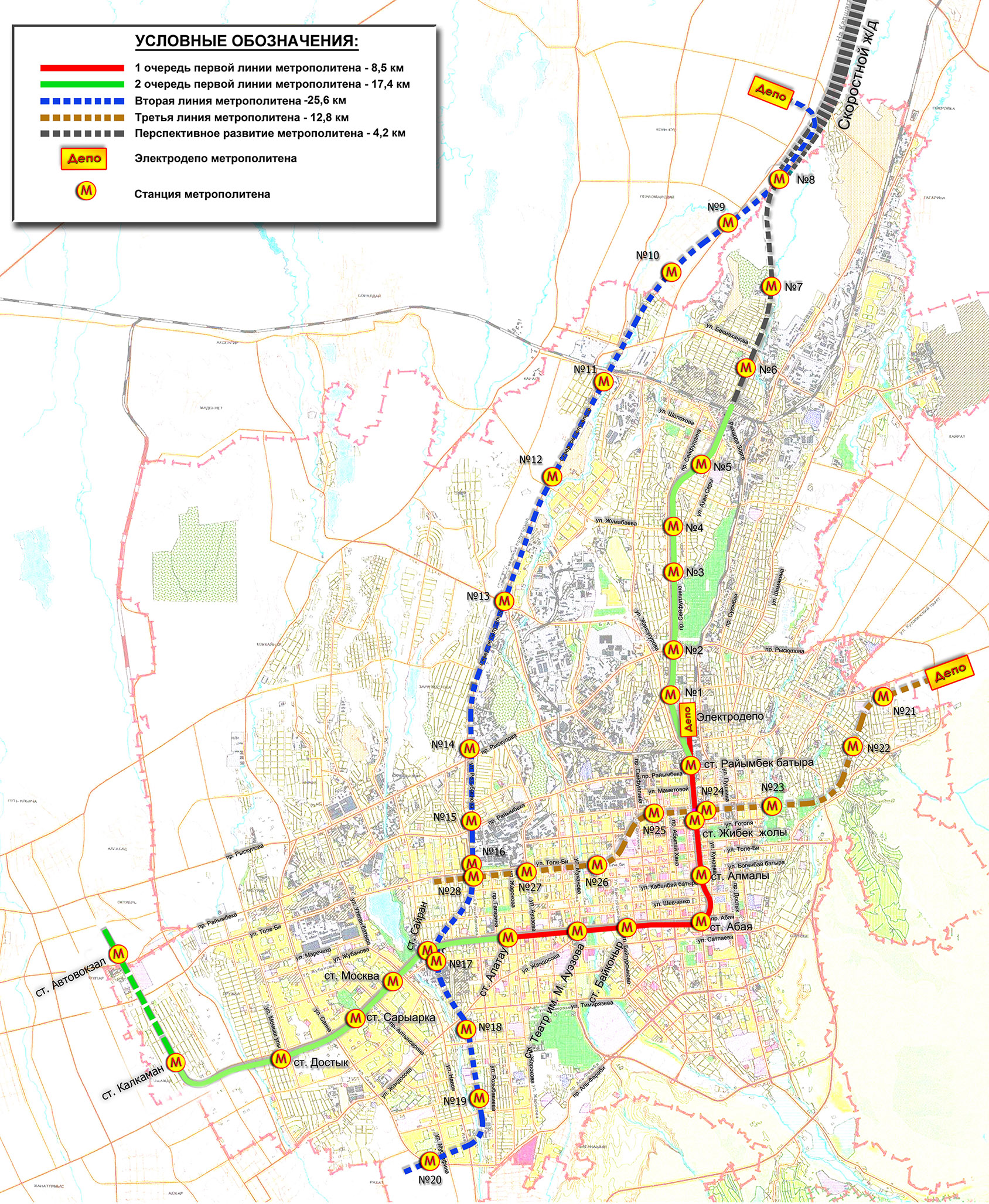 Құрылыс жөнінде ақпарат Құрылыс және техникалық жабдықтау Алматы қаласы метрополитенінің бірінші желісін жобалау Метрогипротранс институтымен (Москва қаласы) КСРО МПС 07.04.82 ж. №Ш-11294 бекіткен ТЭН, сондай-ақ КСРО МПС 20.04.82ж. бекіткен жобалау тапсырмасының, КСРО МПС 25.12.00 ж. бекіткен жобаны түзету бойынша және Қазақ КСРО Министрліктер кеңесінің 20.12.90 ж. №18-30/17 қосымша тапсырманың негізінде жүзеге асырылды. Құрылыстың өзгерген шарттарын есепке ала отырып, жобаға Алматы қалалық әкімшілігі Басшысының 06.10.95 ж. хаттамасына сәйкес объектінің атауы және шығындар жинағы құрамы бөлігінде өзгерістер енгізілді. «Алматы қаласы метрополитенінің бірінші кезегін түзету» жобасын 2003 жылы «Метрожобалау» Мекемесі келесі негіздемеде әзірледі: Алматы қаласы әкімінің бірінші орынбасары 2001 ж. 19 қазанда бекіткен Алматы қаласы метрополитенінің бірінші кезегін түзету тапсырмалары. Алматы қаласы Метрополитенінің бірінші кезегі жөнінде жалпы мәліметтер Метрополитеннің бірінші кезектегі трассасы терең қазылған жермен қаланың орталық бөлігі арқылы Райымбек даңғылынан Фурманов көшесі бойымен Абай даңғылына дейін, одан әрі Гагарин даңғылына дейін өтеді. Трассаның алыстағы учаскелері – деподағы тармақтар, Райымбек батыр бекеті және Алатау – терең қазылмаған. Бірінші кезектің жалпы ұзындығы - 8,56 км, бірінші және соңғы бекеттердің осьтерінен пайдалануы - 7,5 км, бекеттердің саны - 7. Бекеттер арасындағы орташа арақашықтық 1,25 км, ең үлкені - 1,596 км, ең азы - 0,99 км. Алмалы – Абай – Байқоңыр аралықтары жоспарында қисықтардың ең аз радиусы – 300м. Аралықтар бойынша трассаның максимал еңісі – 40 %. Трассаның барлық ұзындыққа қатысты қисық сызықты учаскелері 23% құрайды. Алатау бекеті платформаның бүйірлік орналасуымен, платформалары бар қалған бекеттер остров типті. Терең қазылған бекеттер еңісті эскалаторлық тоннельдер бетімен байланысты, онда төрт таспалы эскалаторлар орналасады. Құрылыс учаскесіндегі инженерлік-геологиялық жағдайлар туралы мәліметтер Алматы қаласы метрополитенінің бірегейлігі аса күрделі геотехникалық факторлар кешенімен анықталады: 1. Солтүстік Тянь-Шаннің күрделі өңірлік геодинамикасы; 2.Аумақтың MSK шкаласы бойынша 9-10 балдық жоғары сейсмикалылығы. 3. Тау аралық шұңқыр болып табылатын еңісті рельефпен тау алдындағы аумақ. 4. Топырақтардың әртүрлі болуы, беріктігі әлсіз, майда тасты топырақтар олардың құрамында диаметрі үш метрге дейін қойтастары бар. 5. Аралық және станциялық тоннельдердің 11м-ден 60м-ге дейін тереңдікте әртүрлі тереңдікте орналасуы. Метрополитеннің бірінші кезектегі құрылыс ауданы Іле Алатауының солтүстік бауырында Үлкен және Кіші Алматы өзендерінің конусын шығару шектеулерінде орналасқан. Құрылыс учаскесіне майда тасты топырақтар олардың құрамына өлшемі 200 - 400 мм дейін қойтастары бар және құмды толтырғышымен төселген. Толтырғыш кварцполевошпат құрамдағы әртүрлі түйіршіктегі құммен толтырылған.