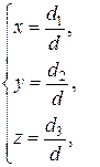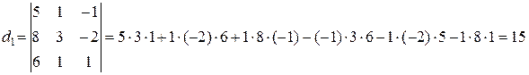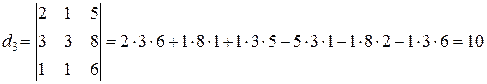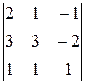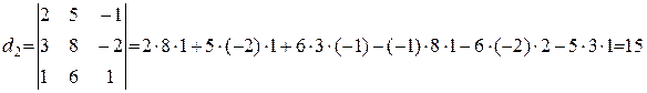 Решение:1) Рассмотрим матрицу системы линейных уравнений Главный определитель матрицы d = ∙ (–1) – (–1) × 3 × 1 – 1× (–2) × 2 –1× 3 ×1 = 5 (вычислили по правилу треугольника). Так как d = 5 ¹ 0, то система имеет единственное решение, которое и можно найти по формулам Крамера. Для системы трех уравнений с тремя неизвестными формулы Крамера имеют вид:
