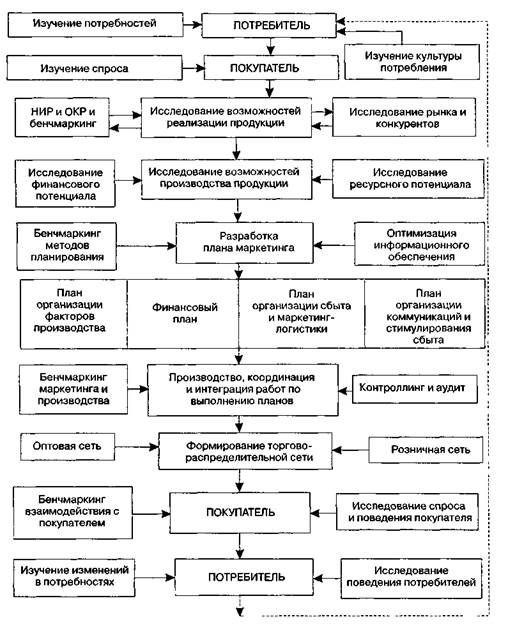 Рис. 1.8. Процесс маркетинга 40_________ Глава 1. Маркетинг как философия и инструментарий предпринимательства Основными разделами плана маркетинга должны быть: план организации факторов производства, их увязки по объемам и срокам выпуска продукции; финансовый план, в котором приводятся обоснования и расчеты прибыли и затрат в рамках запланированных объемов продукции, одновременно для каждого этапа плана маркетинга осуществляется калькуляция расходов и определяется бюджет; план организации сбыта и маркетинг-логистики, который включает операции по определению заданий для распределения и сбыта продукции по зонам оптовой и розничной сети, предусматривает необходимые транспортные средства и графики поставки товара, а при необходимости обосновывает складские помещения для хранения запасов продукции; план организации коммуникаций и стимулирования сбыта, который нацелен на изучение возможностей фирмы в части организации рекламы, ее характера, ее периодичности и интенсивности, а также форм взаимодействия фирмы с поставщиками, партнерами, покупателями (потребителями) и конкурентами. План маркетинга (его обоснованность, объективность, соответствие научным и практическим требованиям) представляет собой отправную точку для осуществления производства продукции. Производство, координация и интеграция работ по выполнению планов — этап процесса маркетинга, который включает мероприятия по контроллингу и аудиту всей маркетинговой деятельности по поддержанию работ для выполнения принятых планов, а также их корректировку на основе бенчмаркинга маркетинговой деятельности и организации производства в смежных отраслях и у конкурентов. На этапе формирования торгово-распределительной сети организуются наблюдения за текущей конъюнктурой и возможностями развития рынка, контроль фактического хода продаж в сравнении с планом. Результаты наблюдения передаются руководству фирмы и сообщаются в оптовые и розничные организации; проводятся мероприятия по обеспечению необходимых товарных запасов и стимулированию потребителей (покупателей); последние охватывают операции по распространению рекламных материалов с учетом типа потребителя (промышленный или непромышленный), по организации деловых встреч, ярмарок, выставок, льготной продажи, премий и других стимулов продвижения и сбыта продукции. Послепродажный этап процесса маркетинга включает две фазы: работу с покупателем и работу с потребителем. Фаза изучения покупателя связана с исследованием спроса и поведения покупателя, а также перспективных форм взаимодействия с потребителем на основе бенчмаркинга этих функций. Фаза изучения потребителя включает исследование поведения потребителей на рынке, изучение характеристик их отношения к товару и к фирме, а также обобщение и анализ возможных изменений в потребностях потребителей. Результаты проведения этого этапа маркетинга докладываются руководству фирмы и служат основой для внесения изменений во все стадии процесса маркетинга. Процесс маркетинга, его знание и возможность оперативного регулирования им позволяют руководству фирмы снижать воздействие фактора неопределенности на результаты принимаемых решений и тем самым уменьшать риск от вложения материальных и финансовых средств в производство товара. Рассмотренная 